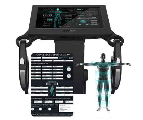 The Evolt 360 body composition scanner is a simple-to-use tool that provides detailed data about a body through more than 40 measurements in just 60 seconds. The Evolt body scanner works by passing a safe electrical current through the feet and hands to measure muscle mass, fat mass, water and mineral in a way that is specific to the individual. This allows trainers to better design a health and wellness program tailored to each person.